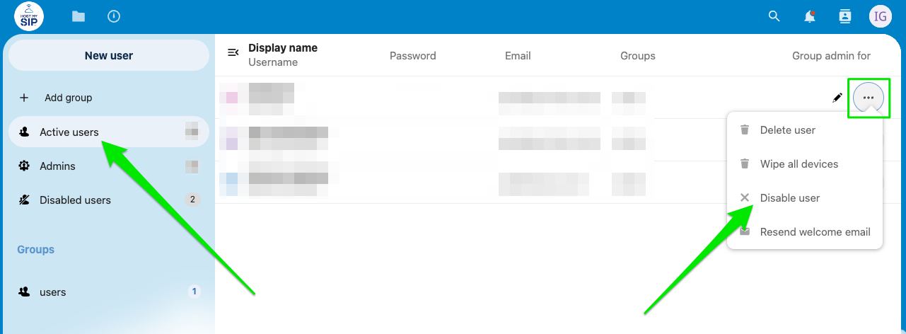 - To disable user select “Active Users”, hover over the user you want to disable and select the option “Disable User”: