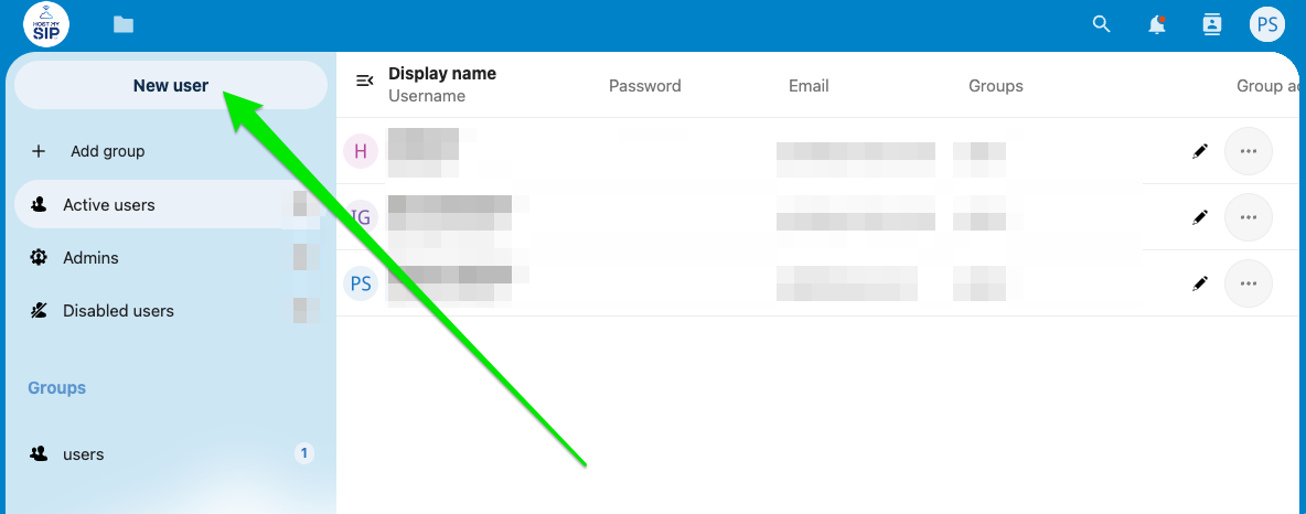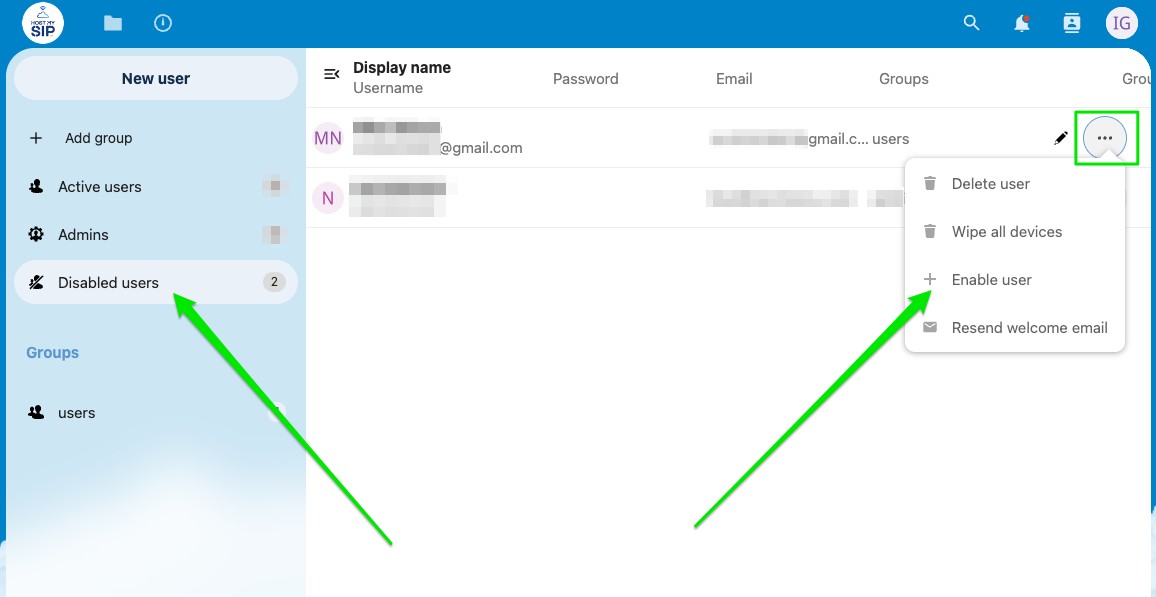- To enable user select “Disabled Users”, hover over the user you want to disable and select the option “Enable User”: