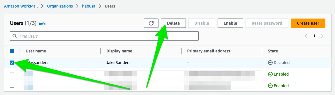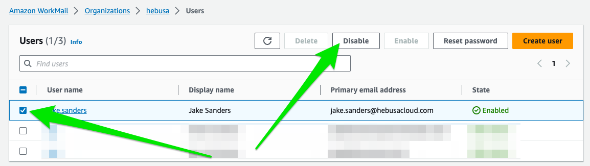 - Once at the Users tab, choose the email address that you would like to delete. First step is choosing the appropriate account by indicating it with a check mark on the left side of the screen. Then, the account needs to be disabled by clicking on the button stating Disable, as shown in Figure 1.3