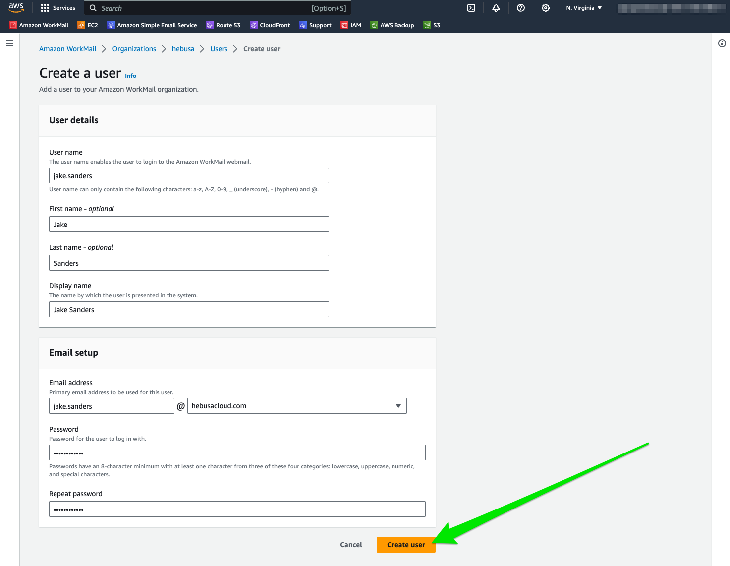 - Upon finishing the previous step, click on the Create user button, shown in Figure 1.5 with a green arrow