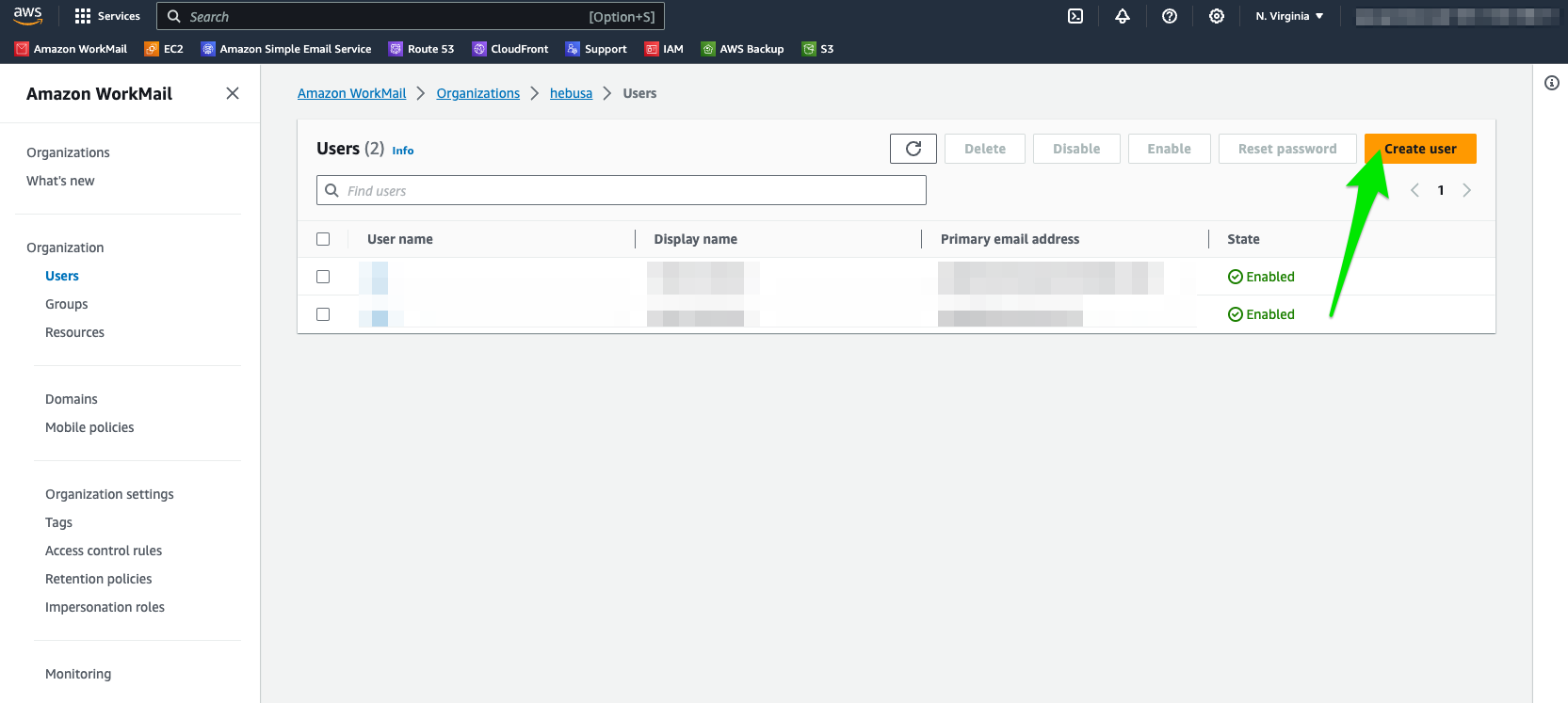- Upon entering the “Users” section of the organization, click on an orange button stating “Create User”(as indicated with a green arrow in Figure 1.3)
